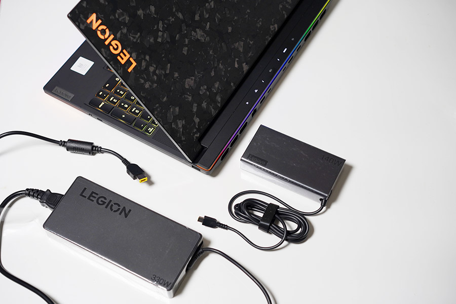 레노버 리전9i는 플래그십 게이밍 노트북 제품인 만큼, 일반 게이밍 노트북들과는 조금 다른 구성품들을 가지고 있는데요. 먼저 전용 어댑터가 2개가 옵니다. 하나는 330W로 고출력 어댑터 이고, 다른 하나도 140W로 역시 고출력이긴 하지만 USB PD 규격으로 충전이 가능한 모델입니다.