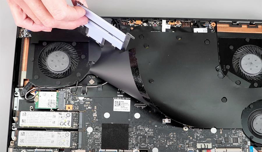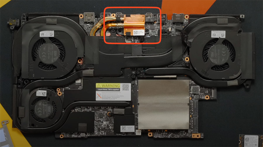 일단 SSD의 경우 쉽게 파츠를 교환할 수 있게 되어 있지만, 램은 기판 안쪽에 있어서 메인보드를 드러내기 전에는 사실상 업그레이드가 안된다는 것, 기판을 드러낼 자신이 있다면 램 교체를 시도해도 되지만 거의 메인 파츠를 다 분해해야 하기 때문에 전문가도 안하는 것이 좋을 것 같더군요. 오른쪽에 보이는 부분이 수랭 쿨링 시스템입니다. 역시 안쪽에 있어서 평소에는 볼 수 가 없겠죠 ^^