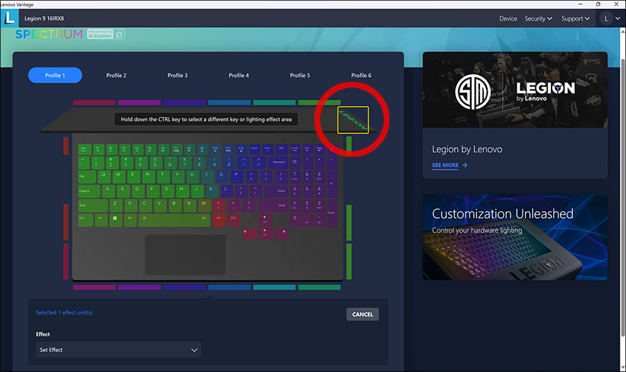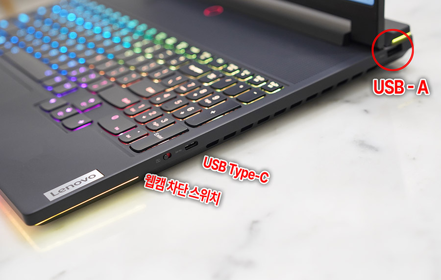 Fn+Q 기능은 성능모드를 전환하는 기능이고, Fn+Space키가 Legion Spectrum RGB 컬러 프로필 전환, 그리고 U와 L키는 눌러보시면 아시겠지만 뒷면에 I/O 포트등과 로고 LED를 껐다 켰다 할 수 있게 만들어두었더군요 ^^