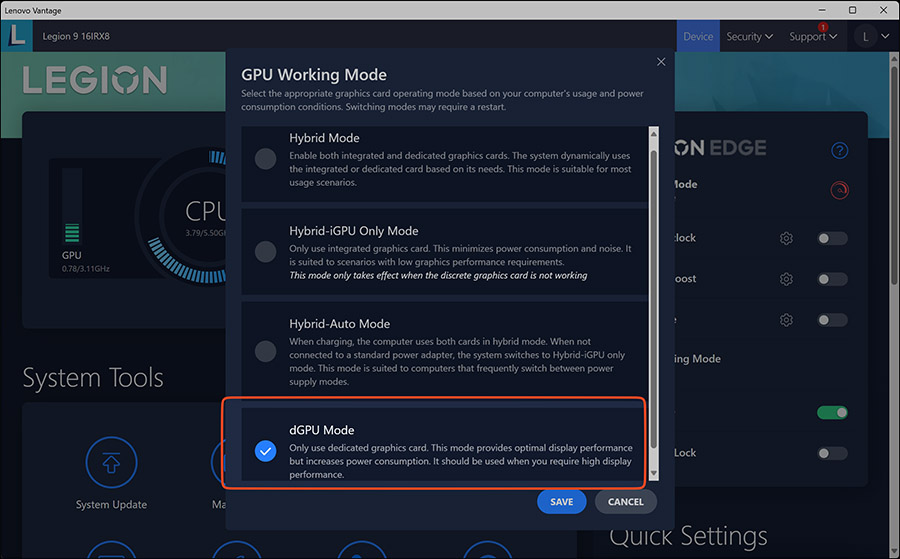 그리고 논옵티로 불리우는 dGPU로 설정을 했습니다. 그리고 Lenovo 노트북이라면 사용되는 관리 툴인 Lenovo Vantage에서 여타 설정을 끝내면 최고성능을 끌어올린 상태로 기기의 성능 벤치마크를 할 수 있습니다.