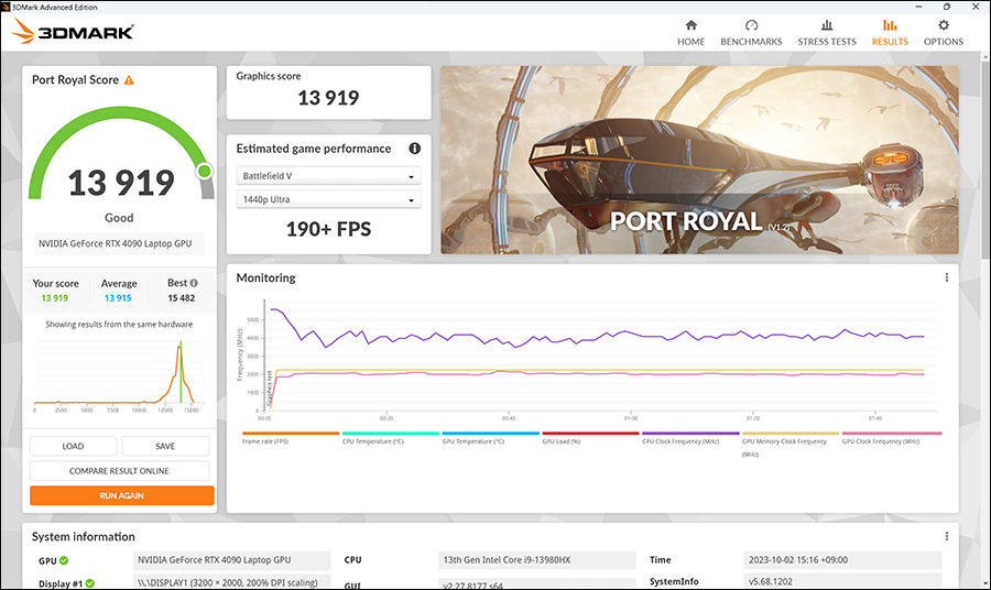 추가적으로 포트로얄(Port Royal) 점수는 13919점 입니다. 3D 게이밍 성능은 지금까지 나온 게이밍 노트북들의 상급 라인들 거의 압살해버린다고 생각을 합니다. 레노버 리전9i는 플래그십 모델로 레노버에서 각을 잡고 괴물 노트북으로 포지셔닝을 한 것 같아요.