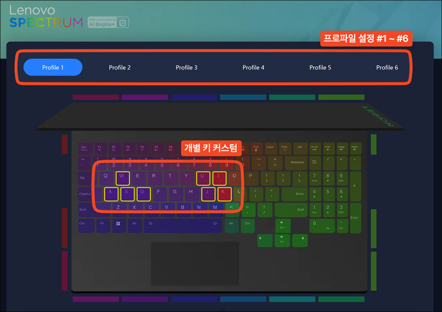 리전 스펙트럼 RGB 컬러 백라이트 조명 효과 기능을 조금 더 자세하게 보면 6개의 프로필을 내 마음대로 하나하나 설정해서 저장해둘 수 있고... (Fn+Space로 저장된 프로필을 퀵하게 전환)