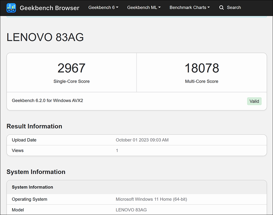 조금 더 캐주얼 하게 성능을 가늠해볼 수 있는 긱벤치6 입니다. 싱글코어 점수는 2000점을 가볍게 넘겨 3000점에 가까운 2967점이고, 멀티코어 점수는 18078점이네요.