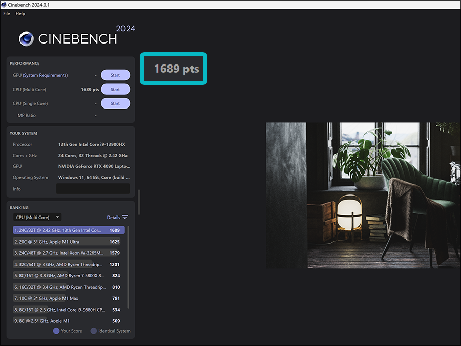 CPU 멀티코어 점수는 1689점이 나옵니다. Cinebench 2024 테스트로는 아직 다른 기기들과의 벤치마크 점수 비교가 힘들 것 같아서, 조금 더 보편적으로 쓰이는 씨네벤치 R23을 돌려보았습니다.