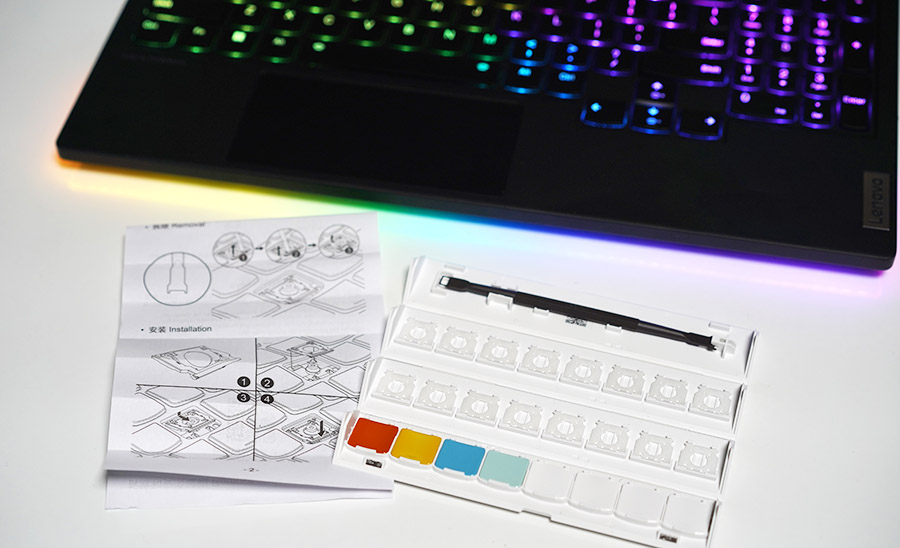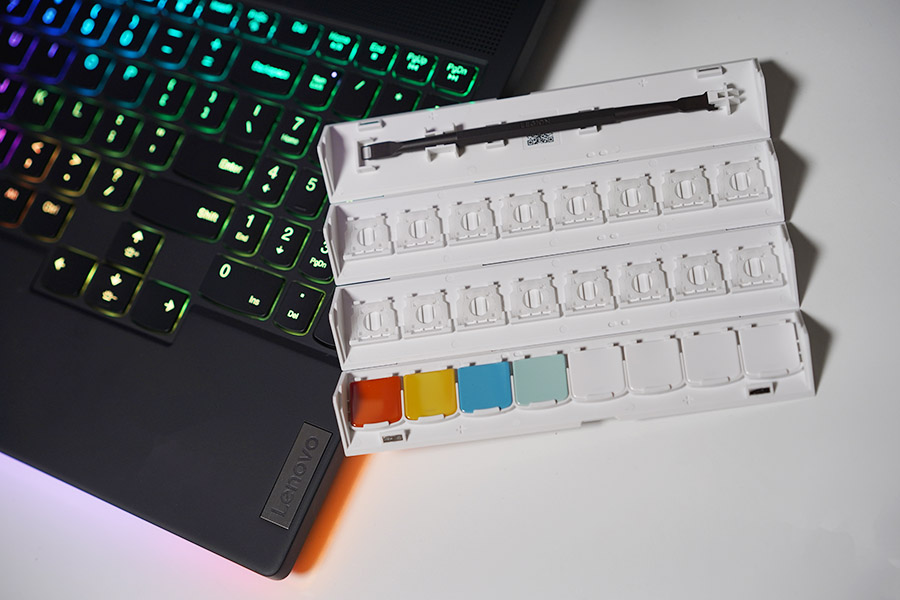 추가로 레노버 리전9i 게이밍 노트북의 또다른 특전 같은 구성품으로... 흰색 마그네틱 박스에 들어있는 추가 키캡과 교체용 예비 스위치들이 있습니다.