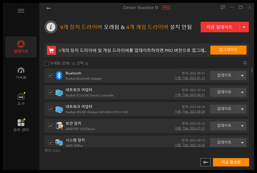 ์ด๋ ๊ฒ ํ๋ก๊ทธ๋จ์ ์ค์นํ๊ณ ์คํํด๋ณด๋ฉด ์๋์ฐ ์ ๋ฐ์ดํธ๋ ๋ค๋ฅธ ํ๋ก๊ทธ๋จ์์ ์๋์ผ๋ก ์ก์ง ๋ชปํ๋ ๋๋ผ์ด๋ฒ ์ค ํ์ํ ๊ฒ๋ง '์ ๋ฐ์ดํธ'๋ฅผ ํด๋ฆญํด์ ๋๋ผ์ด๋ฒ๋ฅผ ์ค์นํด์ค๋๋ค. ์ํ๋ ํธํ ๋๋ผ์ด๋ฒ๋ ์ต์ ๋๋ผ์ด๋ฒ ์ ๋ฐ์ดํธ๋ฅผ ๋๋๋ค๋ฉด ํ๋ก๊ทธ๋จ์ ์ธ์ธ์คํจ (์ ๊ฑฐ)ํด์ฃผ๋ฉด ๋์ฃ . ์ฐธ๊ณ ๋ก Driver Booster์์ ๊ถ์ฅํ๋ ๋ชจ๋ ๋๋ผ์ด๋ฒ๋ฅผ ์ต์ ์ ๋ฐ์ดํธํ ํ์๋ ์์ต๋๋ค. ๋๋ผ์ด๋ฒ๋ ํฐ ๋ฌธ์ ์์ง ์ ์๋ํ๋ฉด ๊ทธ๋ฅ ๋๋๊ฒ ๋์ ๋๋ ์์ผ๋๊น์ :)
