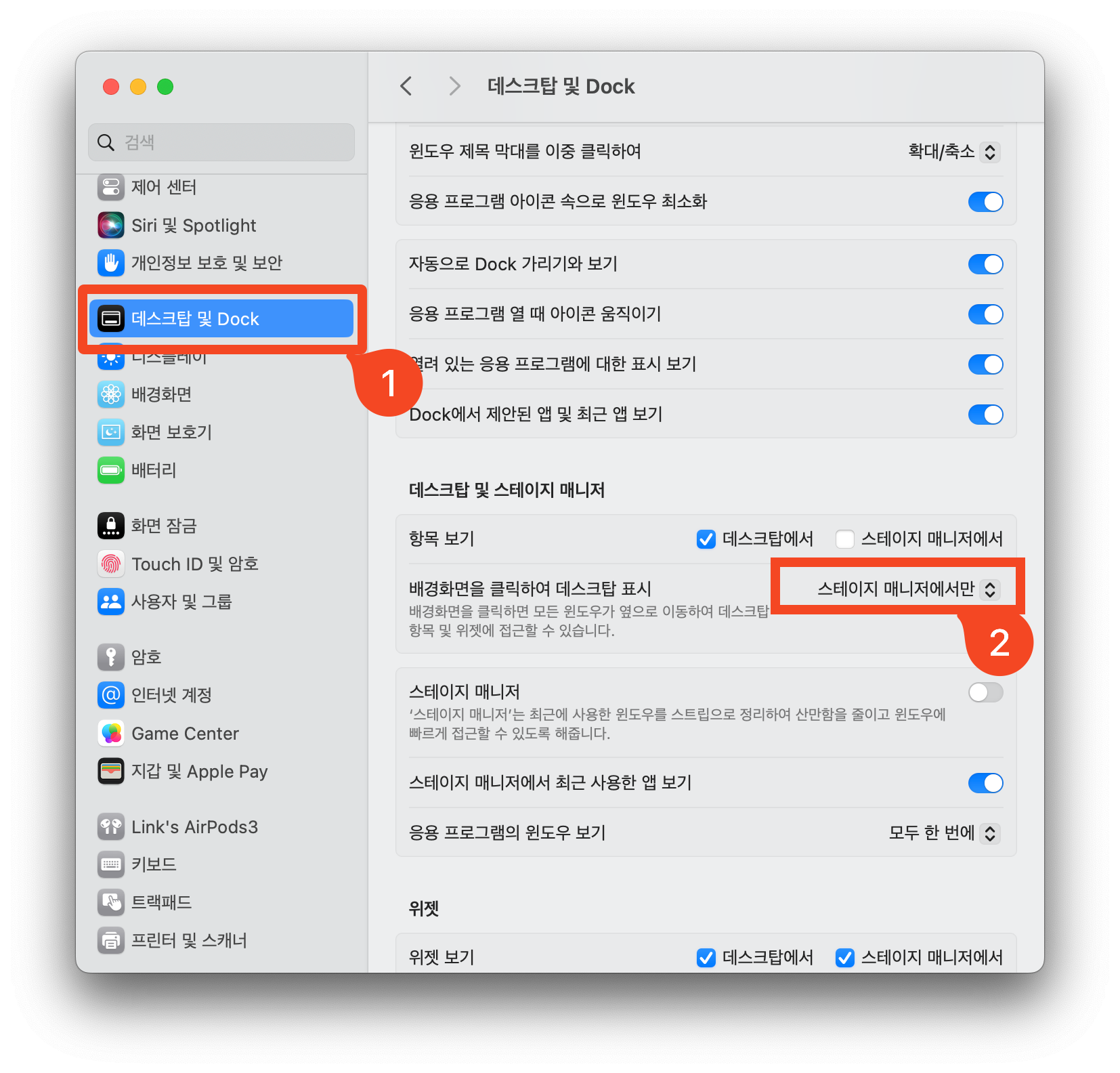 ์์คํ ์ค์ ์ฑ์์ '๋ฐ์คํฌํ ๋ฐ Dock'์ ์ฐพ์ ๋ค์ด๊ฐ์, ๋ฐฐ๊ฒฝํ๋ฉด์ ํด๋ฆญํ์ฌ ๋ฐ์คํฌํ ํ์ ๊ธฐ๋ฅ์ '์คํ ์ด์ง ๋งค๋์ ์์๋ง'์ผ๋ก ๋ฐ๊พธ์ด ๋๋ฉด ์์ ์ฒ๋ผ ๋ฐํํ๋ฉด์ ์๋ฌด ๊ณณ์ด๋ ํด๋ฆญํ์ ๋ ๋ฐ์คํฌํ ๋ณด๊ธฐ ๊ธฐ๋ฅ์ด ์๋ํ์ง ์๋๋ก ์ธํ ๋ฉ๋๋ค. :)
