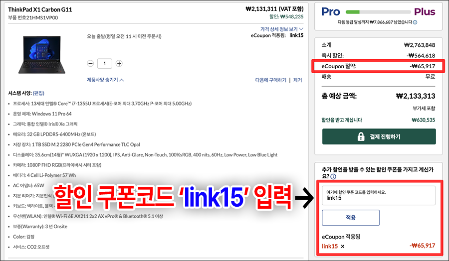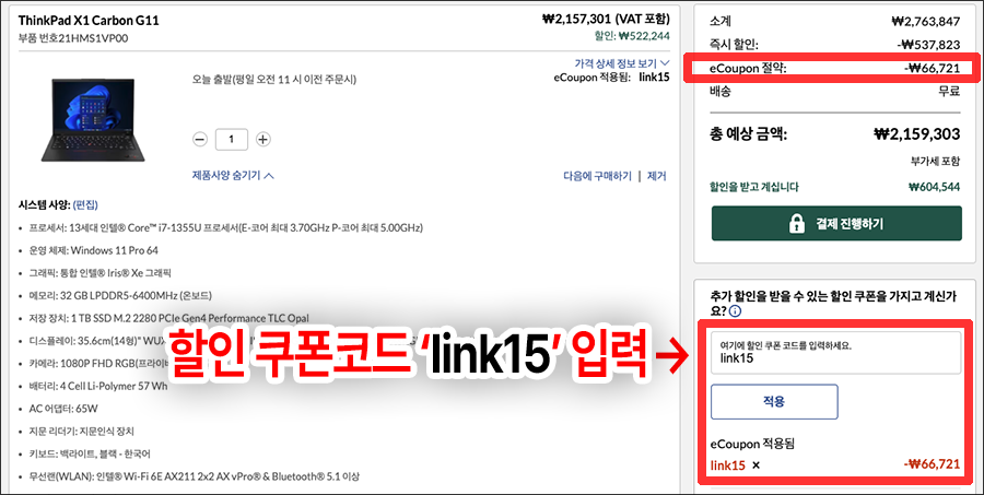 레노버 씽크패드 장바구니 eCoupon 쿠폰코드: link15