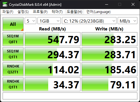 최대 읽기속도 약 547MB/s, 최대 쓰기속도는 283MB/s 입니다. 규격은 M.2 2242이기 때문에, 일단 스토리지가 있는 모델로 구입해서 윈도우11 정품 혜택을 누리고, 조금 더 성능이 좋은 M2 2242 SSD를 구입해서 교체하는 것도 좋을 것 같네요. :)