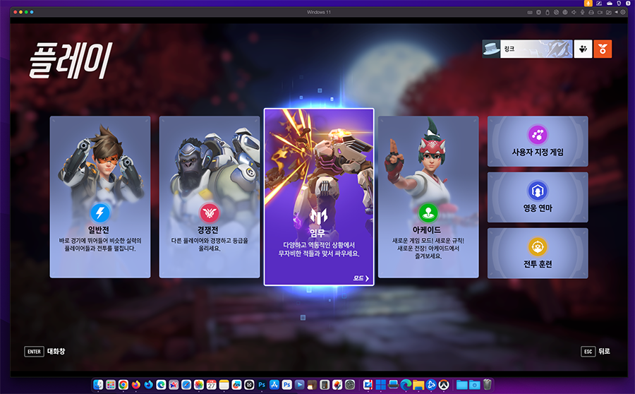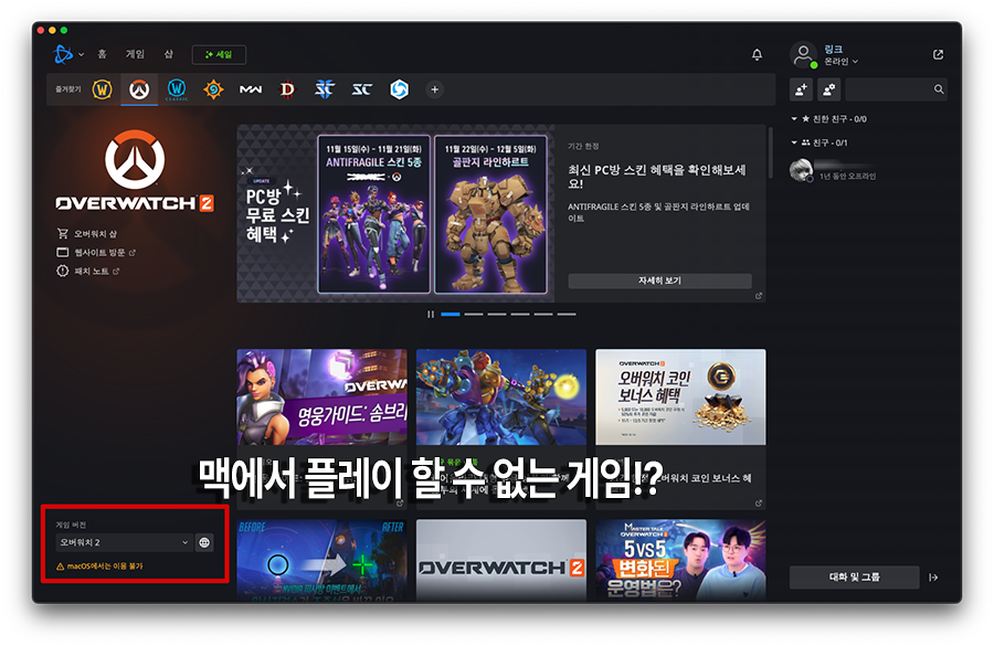 ์ค๋์ ๊ฐ๋จํ๊ฒ ์ ๊ฐ ์ค๋๋ง์ ๋ค์ ํ๋ ์ด ํ๋ ๊ฒ์์ธ ์ค๋ฒ์์น (Overwatch 2)๋ฅผ ๋งฅ ํ๊ฒฝ์์ ํ๋ ์ด ํ๋ ๊ณผ์ ์ ๊ฐ๋จํ๊ฒ ์๊ฐํด๋ณผ๊น ํฉ๋๋ค.