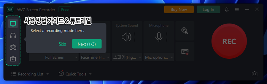์์ฃผ ์ฌ์ฉํ๋ ๋ฉ๋ด๋ค๊ณผ, ํ๋ฉด ๋ นํ๋ฅผ ์คํํ๋ (๊ฐ์ฅ ์ค์ํ) REC ๋ฒํผ, ๊ทธ๋ฆฌ๊ณ ๋ นํ ์๋ฃ๋ ์์ ํ์ผ๋ค ๋ชฉ๋ก์ ๋ณผ ์ ์๋ UI ์ฌ์ฉ๋ฒ์ ๊ฐ๋ตํ๊ฒ ์๋ ค์ฃผ๋๊ตฐ์. ์ค์ ๋ก AWZ ์คํฌ๋ฆฐ ๋ฆฌ์ฝ๋ ์ํํธ์จ์ด๋ ์๋์ ๊ฐ์ด ์ง๊ด์ ์ผ๋ก ์ฌ์ฉํด๋ณผ ์ ์์ต๋๋ค.