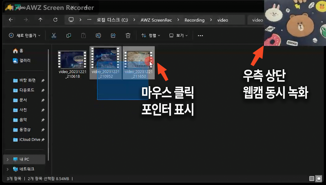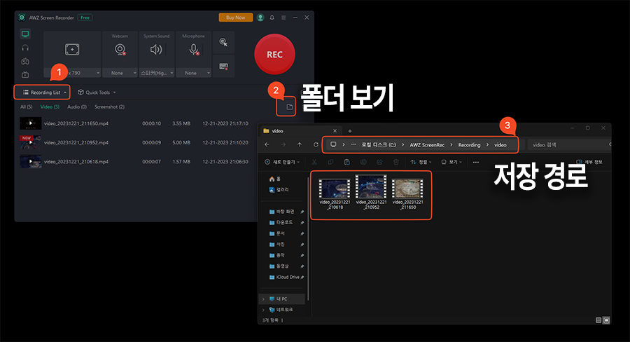 ๋ นํ๋ฅผ ์๋ฃํ๊ณ ๋๋ฉด Recording List ๋ฒํผ์ ๋๋ฌ์ ๋ นํ๋ ์์ ํ์ผ๋ค์ ๋ณผ ์ ์๋๋ฐ์. ์ฐ์ธก ํด๋ ์์ด์ฝ์ ๋๋ฅด๋ฉด ํด๋๊ฐ ๋ฐ๋ก ํ์๊ธฐ์์ ์ด๋ฆฝ๋๋ค. ํ์ผ ๊ฒฝ๋ก๋ฅผ ๋ณด๋ C:\AWZ ScreeRec\Recording\Video ํด๋ ์์ ์บก์ฒ๋ฅผ ๋ฌ ์์๋ค์ด ์ฐจ๊ณก์ฐจ๊ณก ์ ์ฅ๋๋ ๊ฒ์ ์ ์ ์์ต๋๋ค.