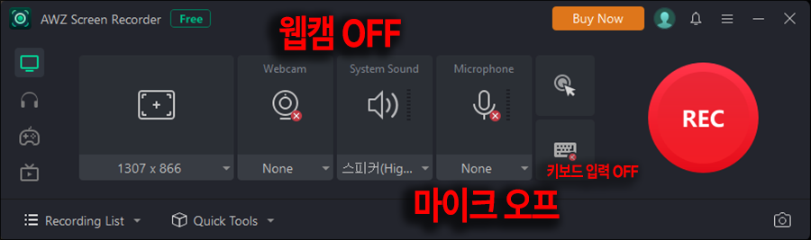 ๋ณธ๊ฒฉ์ ์ผ๋ก AWZ Screen Recorder๋ฅผ ์ฌ์ฉํด๋ณด๊ธฐ ์ํด ์ํ๋ ๋ นํ ์ค์ ์ ํด๋ณธ ๋ชจ์ต์ ๋๋ค. ์น์บ ๋ นํ๋ ๋ฐ๋ก ํ์ ์์ ๊ฒ ๊ฐ์ ํ๋ฒ ํด๋ฆญํด์ OFF๋ก ํด๋๊ณ , ๋ด ์์ฑ์ ๋ น์ํ ๊ฒ์ ์๋๊ธฐ์ ๋ง์ดํฌ๋ OFF๋ก ํด๋์์ต๋๋ค.