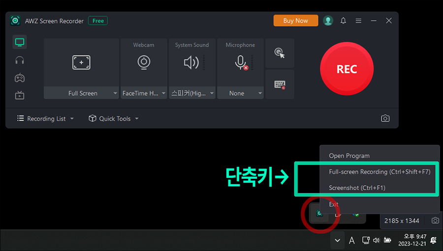 ์๋์ฐ์ฉ AWZ Screen Recorder ํ๋ก๊ทธ๋จ์ ์คํํ๋ ๋์ ์ฐ์ธก ํ๋จ์ ์๋ ํธ๋ ์ด ์์ญ์ ์์ด์ฝ์ด ํ์๋๋๋ฐ์. ๋๋ฌ๋ณด๋ฉด ์์ ๊ฐ์ด ๋จ์ถํค๋ฅผ ํตํด ์ค์ท์ ์ฐ๊ฑฐ๋, ์ ์ฒด ํ๋ฉด ๋ นํ๋ฅผ ์์ํ ์ ์๋ ๊ฒ ๊ฐ์ต๋๋ค. ์ฐธ๊ณ ํด๋ณด์๋ฉด ์ข์ ๊ฒ ๊ฐ๋ค์.