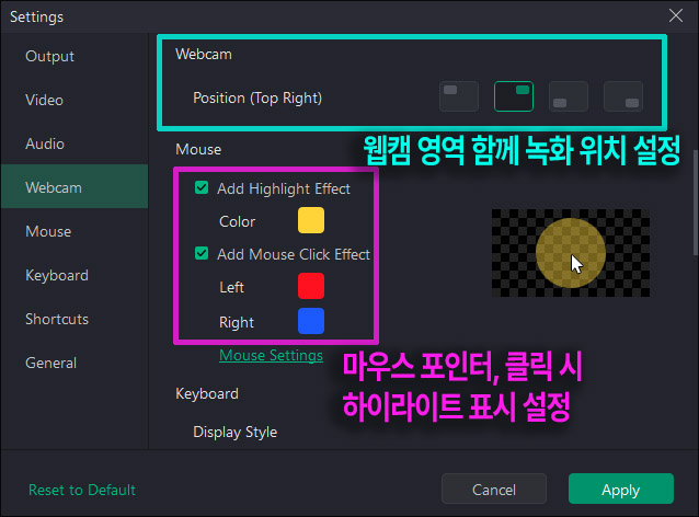 ์ด๋ฐ์๋ ์ค์ ์ ๋ค์ด๊ฐ์ ์ด๋ค ๊ธฐ๋ฅ๋ค์ด ์๋ ์ดํด๋ณด๋ฉด... ์ปดํจํฐ ํ๋ฉด๊ณผ ํจ๊ผ ์น์บ ์ ํจ๊ป ๋ นํ ํ ์ ์๋ ์์ญ์ ์ด๋์ ์์น์ํฌ์ฐ Position์ ์ค์ ํ ์ ์๊ณ ... ๋ง์ฐ์ค ์ปค์๋ฅผ ํจ๊ป ๋ นํํ๋ฉด ํ์ดํธ๋ผ์ดํธ ์์ญ์ด๋ ์ขํด๋ฆญ, ์ฐํด๋ฆญ ํ ๋ ์ปฌ๋ฌ๋ฅผ ๋ค๋ฅด๊ฒ ๋ณด์ฌ์ฃผ๋ ์ค์ ๋ ํ ์ ์์ต๋๋ค.