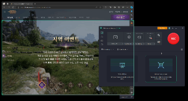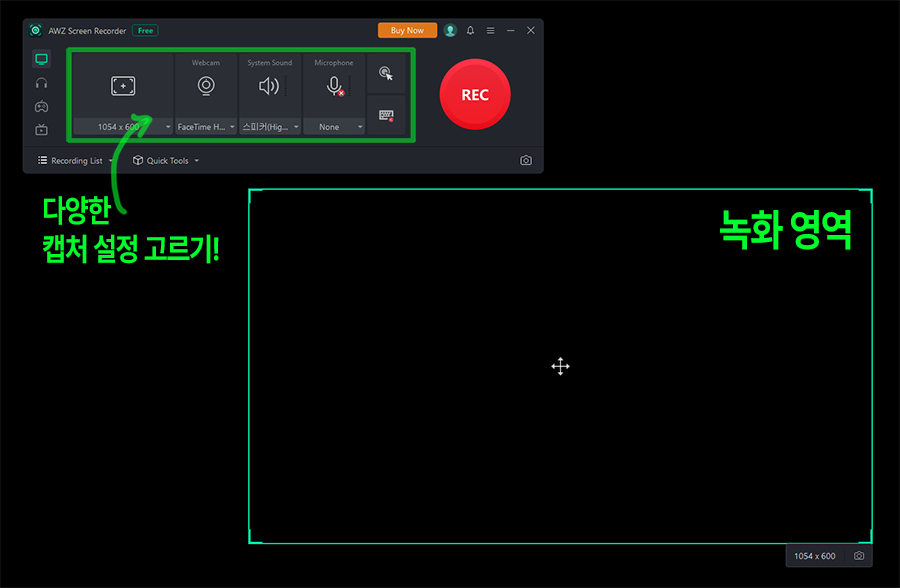 ๋ นํ ์์ญ์ ์ฒญ๋ น์ ์์ญ์ ๋ง์ฐ์ค ๋๋๊ทธ๋ก ์ค์ ํ๋ฉด ๋๊ณ , ์บก์ฒ๋ฅผ ํ๊ณ ์ถ์ ์์ญ ์ค์ ์ด ์ ๋๋ก ๋์๋ค๋ฉด ๋นจ๊ฐ REC ๋ นํ ๋ฒํผ์ ๋๋ฅด๋ฉด 3์ด ๋ค์ ์์ ๋ นํ๊ฐ ์์๋ฉ๋๋ค.