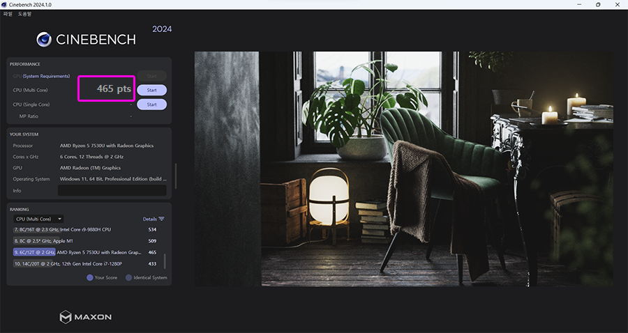 그리고 씨네멘치 2024 점수는 465점 이네요. M1 맥북이 500점대니, 살짝 못미치는 성능이라고 할 수 있겠습니다. 그래도 업무용 노트북으로 차고 넘치는 수준이죠 :)