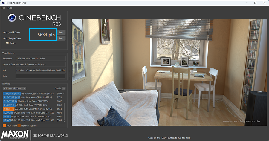개인적으로 컴퓨터를 사서 항상 벤치마크를 직접 돌려보는 편입니다. 씨네벤치 점수도 제가 기억을 하기 위해 기록을 해둡니다. 인텔 i3-1215U 프로세서, 16GB 램 사양을 가진 노트북의 씨네벤치R23 점수는 5634점입니다.