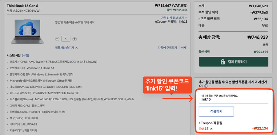 * 참고로 레노버 공홈에서 구입하실 때 장바구니 결제 직전에 '쿠폰코드'를 입력하는 과정이 있습니다. 이때 위에 쿠폰코드를 입력하시면 추가할인을 받을 수 있으니 참고하시기 바랍니다 :)