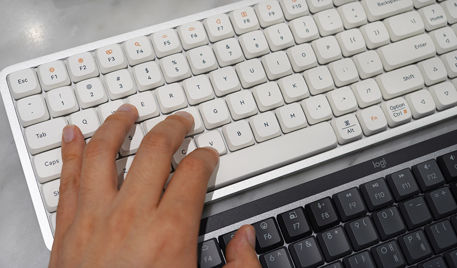 키감을 비교하면 로프리 플로우의 키감이 상당히 독보적입니다. 일단 타건 소리가 조약돌을 두드리는 듯 단단한 것이 그 매력에 빠지면 쉽게 헤어나오지 못하게 되는 것 같네요. 반면 로지텍 MX 메카니컬은 착착 감기는 느낌이만 찰칵커리는 타건음이 최근 트렌드는 아닌 것 같고, 로프리 플로우 키보드다 조금 더 세련된 키감을 가진 것 같습니다.