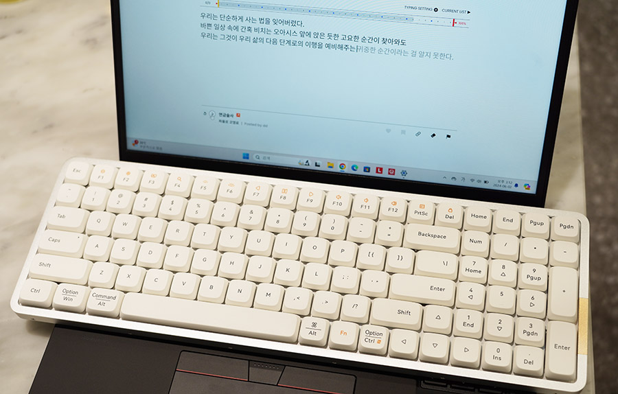 그래도 콤팩트 하고, 노트북 위에 올려두고 타이핑을 해도 안정적이라는 것이 참 마음에 드네요. 가스켓 구조로 통울림을 잡은 최초의 로우프로파일 키보드로도 알려진 만큼 매우 만족스럽습니다. 2024년 제 인생 키보드를 찾은 느낌입니다.