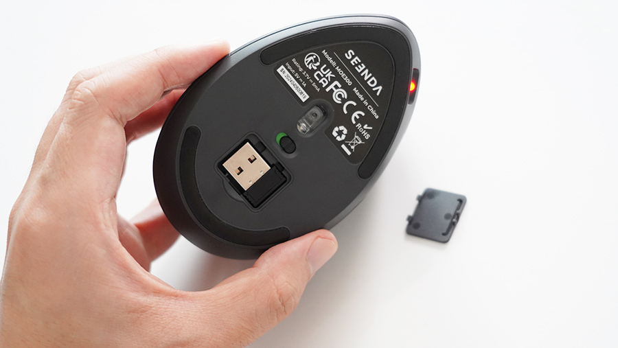 하단에 마우스 ON/OFF 스위치가 있고, USB 무선 리시버를 수납하는 공간이 있습니다. 리시버를 꺼내어서 PC에 연결하면 무선 마우스로 사용할 수 있습니다.