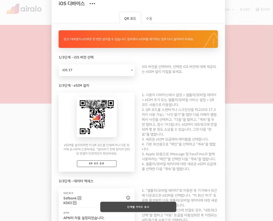 QR코드가 보이죠? 그리고 아이폰인지 안드로이드인지, 어떤 버전을 사용하는지 선택하면 단계별로 안내를 잘 해주고 있습니다. 한국말로 쓰여져 있지만 살짝 헷갈리는 부분이 있기는 한데, 잘 따라하면 어느새 eSIM을 등록할 수 있습니다.