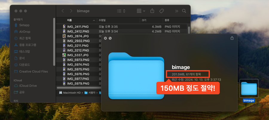์ด๋ ‡๊ฒŒ ImageOptim์œผ๋กœ ์••์ถ•์ด ์™„๋ฃŒ๋œ ํด๋”์˜ ์šฉ๋Ÿ‰์„ ๋‹ค์‹œ ๊ณ„์‚ฐํ•ด๋ณด๋‹ˆ, 150MB ์ •๋„ ์ ˆ์•ฝ๋œ ๊ฒƒ์„ ํ™•์ธํ•  ์ˆ˜ ์žˆ์—ˆ์Šต๋‹ˆ๋‹ค. ํ‰๊ท  9MB ์ด๋ฏธ์ง€๋“ค์ด 4MB ์ •๋„๋กœ ์••์ถ• ๋œ ๊ฒƒ์ด๋‹ˆ, ๊ฝค ์“ธ๋งŒํ•˜๋‹ค๋Š” ์ƒ๊ฐ์ด ๋“œ๋„ค์š”.