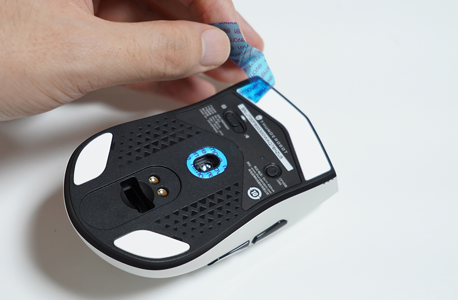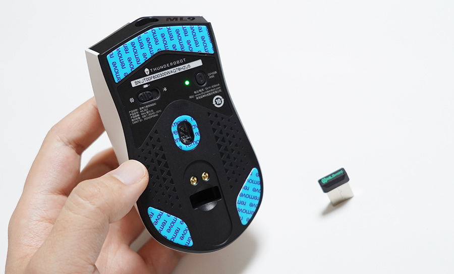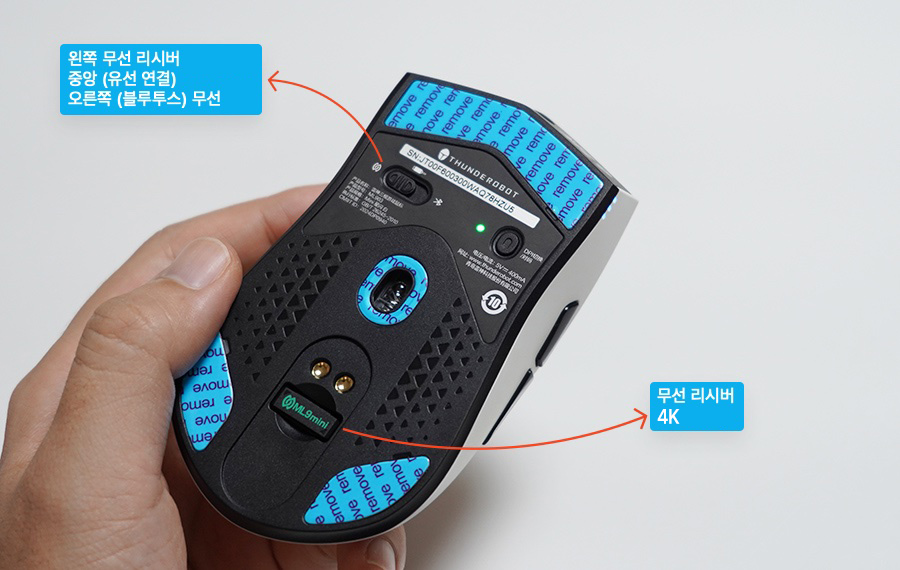 마우스를 가장 먼저 살펴보면, 밑면은 이렇게 되어 있습니다. 스위치는 왼쪽으로 하면 무선 모드, 중간은 유선 케이블 모드, 그리고 오른쪽으로 하면 블루투스 무선을 지원합니다. 블투 무선을 같이 지원하기에 정말 유용해보이네요. 로지텍 게이밍 마우스들 중 무선을 지원해도 블투 무선을 지원하지 않는 경우가 있어서 불편한데, 썬더로봇 ML903 무선 마우스는 4K 무선과 블루투스 무선을 지원해서 좋습니다.