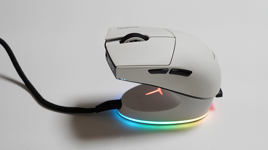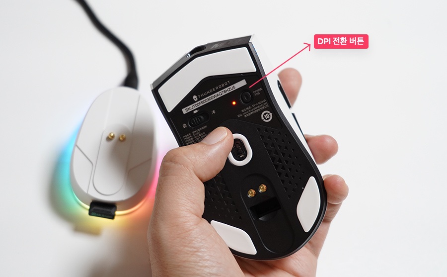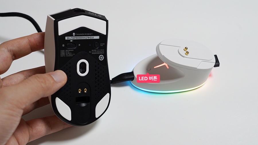 충전 독에 있는 버튼은 누를 때 LED 불빛 효과가 전환됩니다. 작은 부분까지 꽤 세세하게 신경을 잘 써두었네요. 저가형 제품이 아니고 게이밍 마우스에 진심인 기업이 만든 것 같다는 생각이 듭니다.