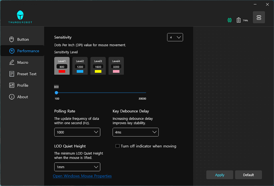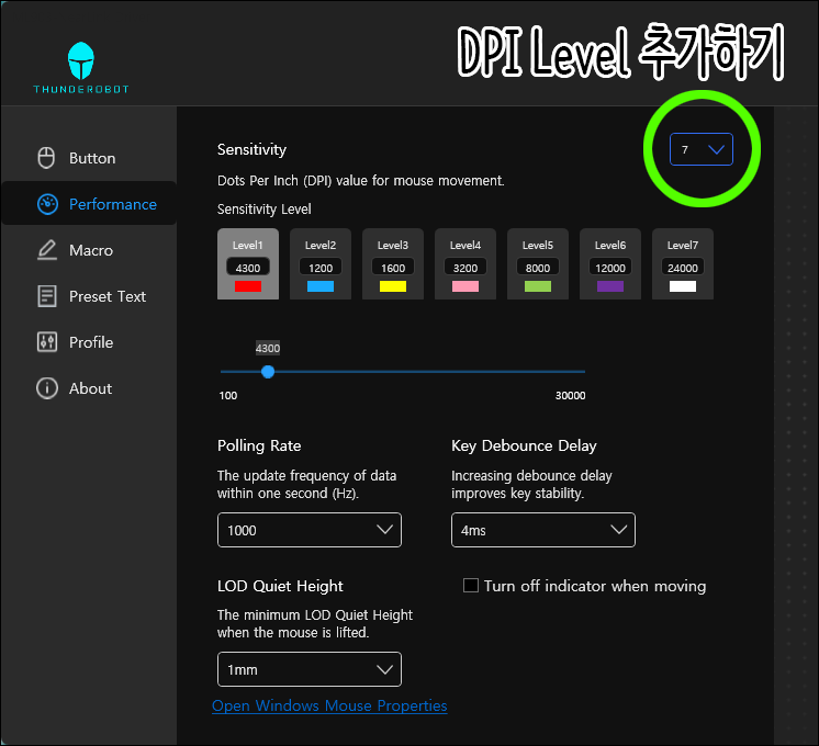 하단 오른쪽에 있는 버튼은 DPI 전환 버튼인데요. 놀라운 것이... Thunderobot 전용 관리 소프트웨어를 설치하면, 아래와 같이 DPI 모드를 몇개로 할지, 몇 DPI로 할지 세세한 커스텀이 가능합니다. 매크로 프로그램밍도 지원하구요.