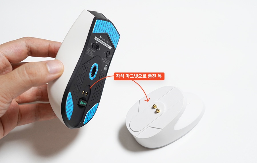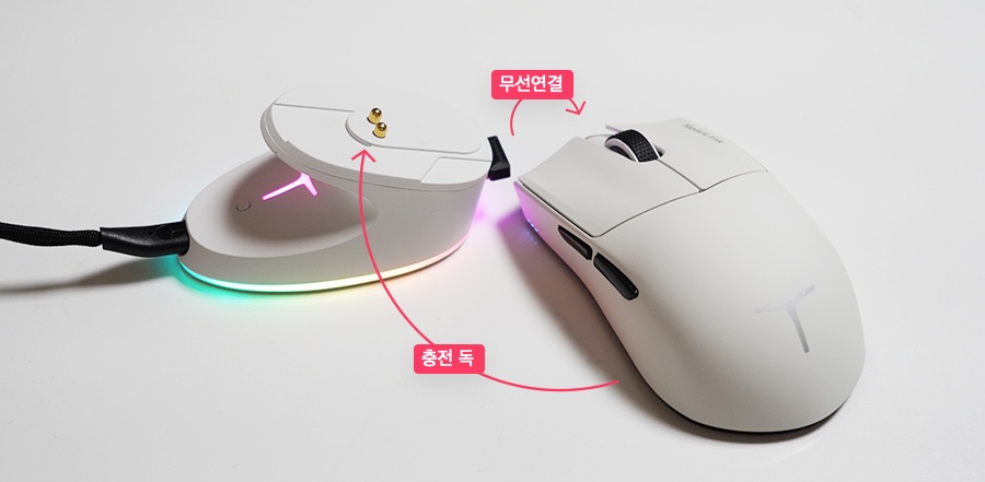 집에서 사용할 때는 4K 충전독을 통해 이렇게 사용하면 됩니다. 휴대하기도 편하고, 충전도 도크 위에 올려두면 자동으로 이뤄지니 정말 편하게 사용할 수 있는 게이밍 마우스 입니다.