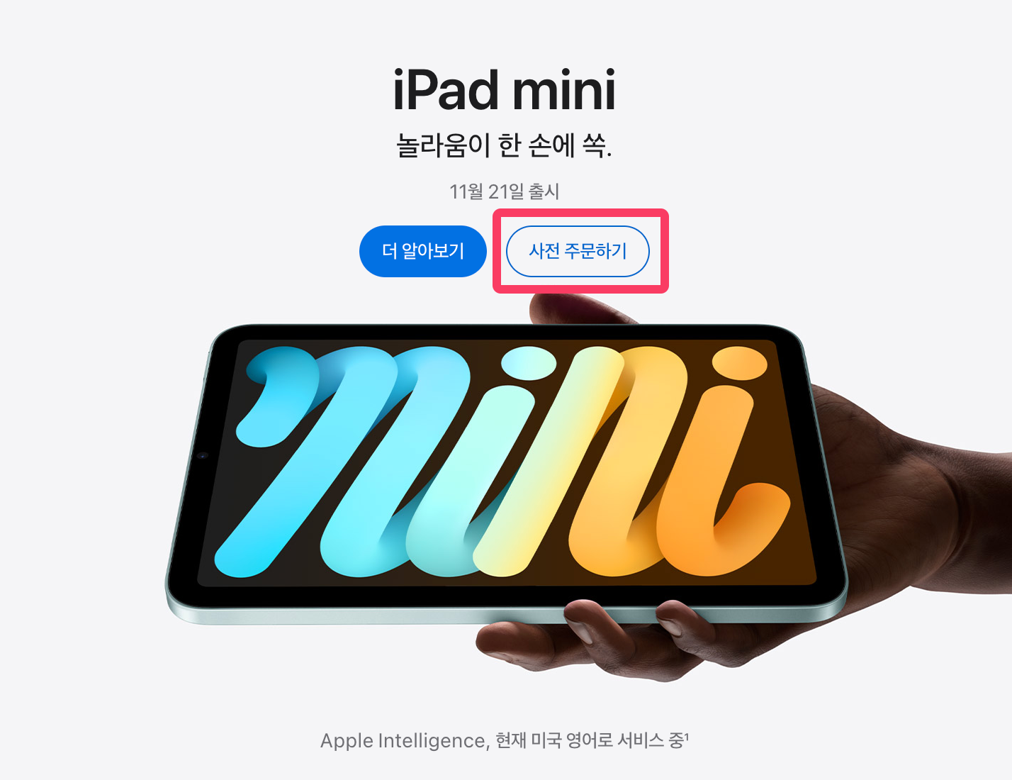 가장 먼저 한손에 들어오는 아이패드 미니 입니다. 2024년에 출시된 아이패드 미니 7세대는 11월 21일 출시 되지만, 오늘 부터 사전예약 구입이 가능한데요.