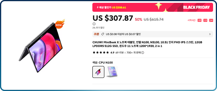 N100 프로세서로 사무용으로는 손색이 없는 태블릿 노트북PC 입니다. 휴대하기도 좋고, 가격도 블랙프라이데이 할인을 받으면 꽤 괜찮아 보이네요.