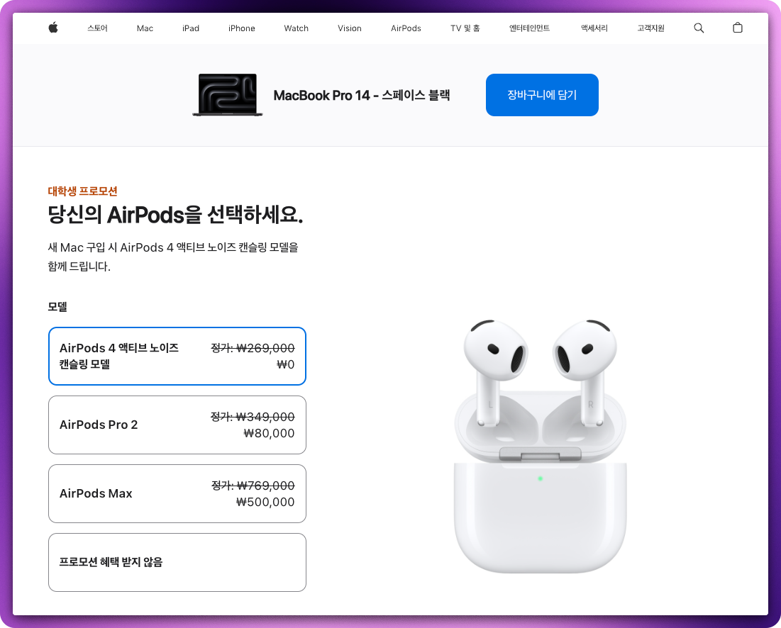 μ μ΄μ μμ΄ν4 (AirPods4)λ₯Ό κ³ λ₯΄κ³ , μ₯λ°κ΅¬λμ λ΄μΌλ©΄ λ©λλ€. 26λ§ 9μ²μμ΄λ νλ μμ΄ν4 λ¬΄λ£ μ¦μ μ΄λΌλ... μ΄λ² κΈ°νλ₯Ό λμΉλ©΄ νννκ² μ£ γ γ