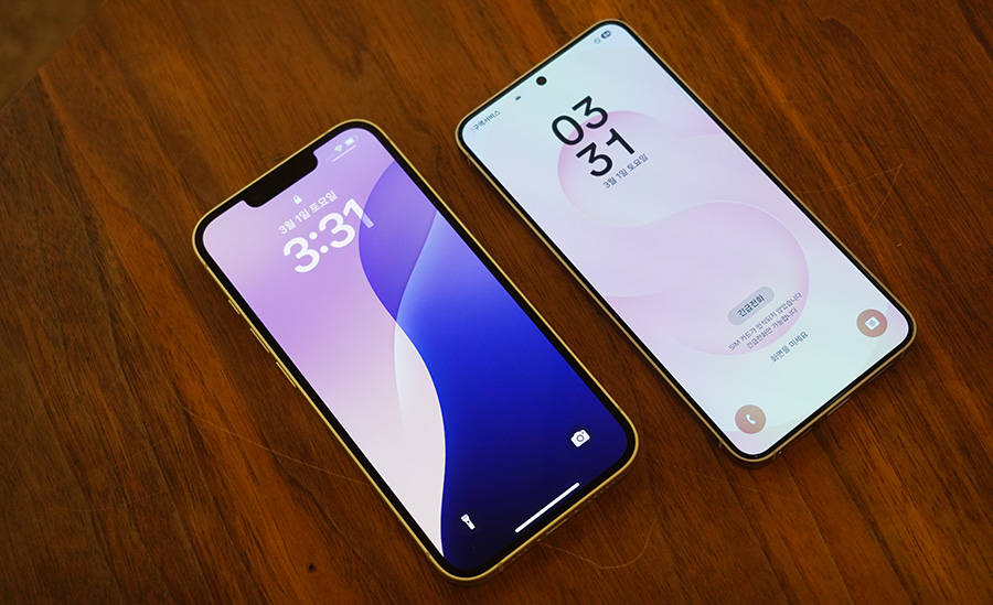 왼쪽이 페이스아이디용 노치가 있는 아이폰16e이고, 오른쪽이 펀치홀 디자인으로 전면 카메라가 있는 갤럭시S25입니다.