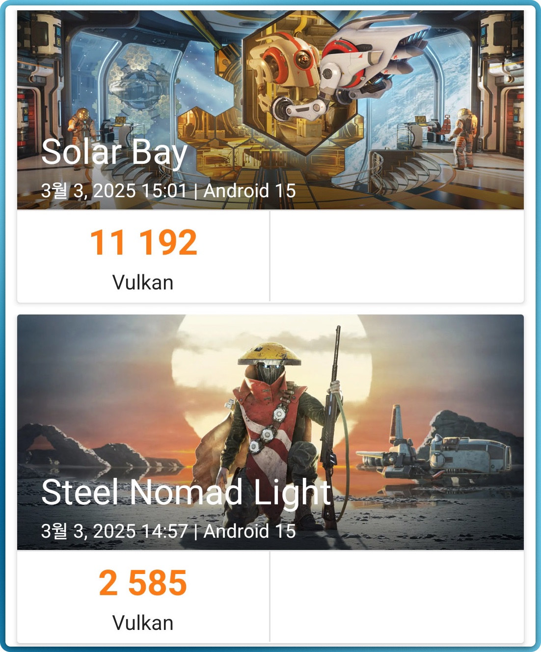 그래픽 점수는 갤럭시S25의 경우 Vuloka 기준으로 솔라베이 11192점, 스틸노마드라이트는 2585점 입니다. 아이폰16e의 점수가 궁금하시면 제가 쓴 아이폰16e 간단리뷰글을 확인해보시기 바랍니다.
